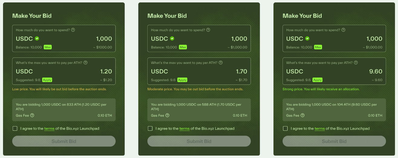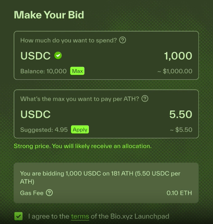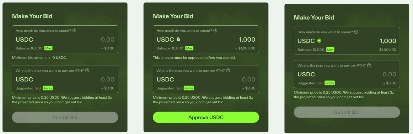 Decide your spending limit, ensuring it exceeds the minimum bid. Click "Max" if you want to use all available Bid Tokens. After entering the amount, approve the bid in your wallet.