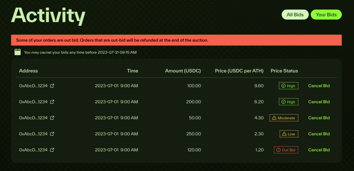 Keep an eye on your bids in the "Your Bids" section. Stay proactive as token prices may change due to competitors' bids. Check real-time bid status for updates.