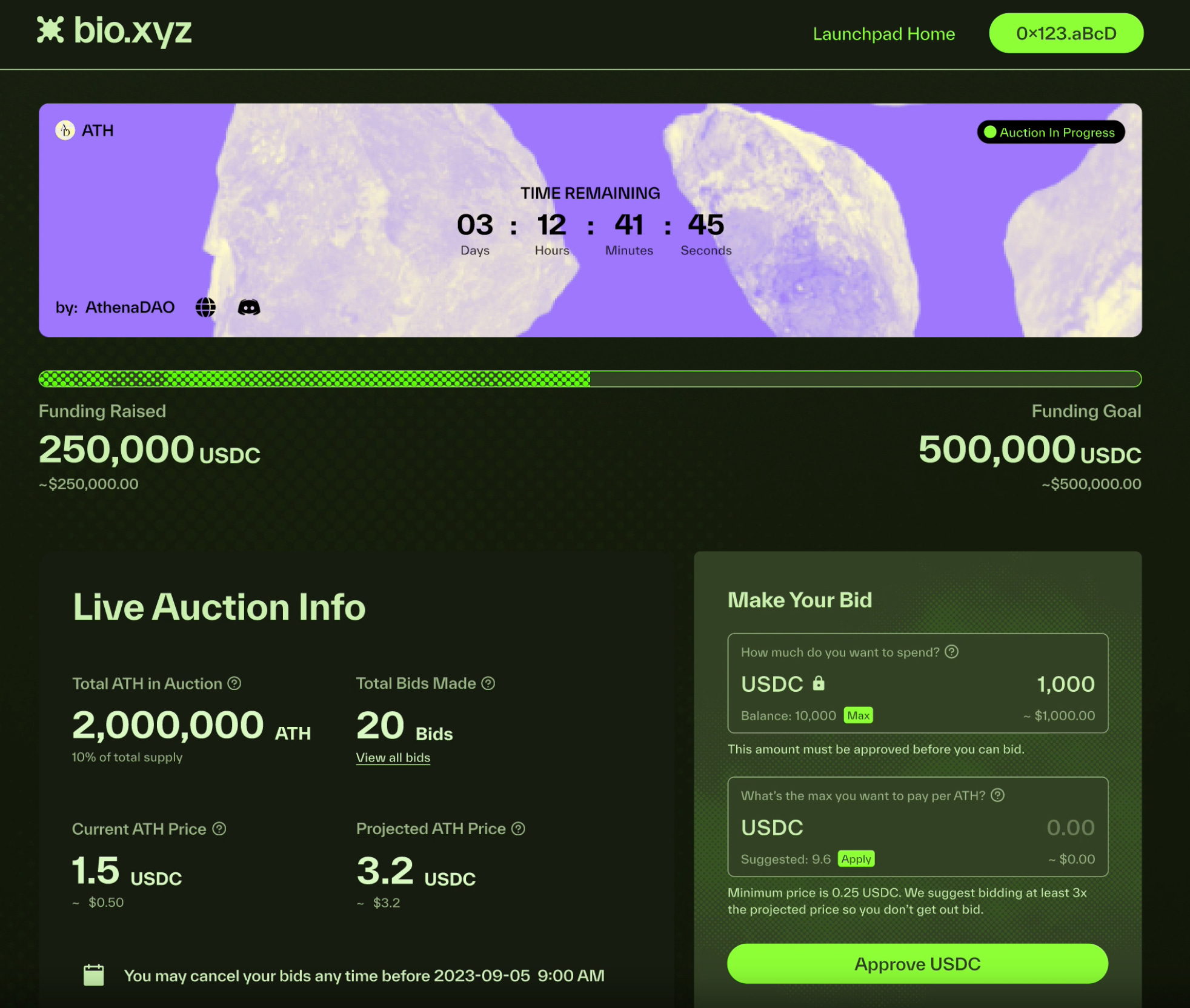 Your bid is submitted after wallet transactions are signed. Add a reminder to your calendar and join the AthenaDAO Discord for updates. Return before the auction ends to monitor your bid status.