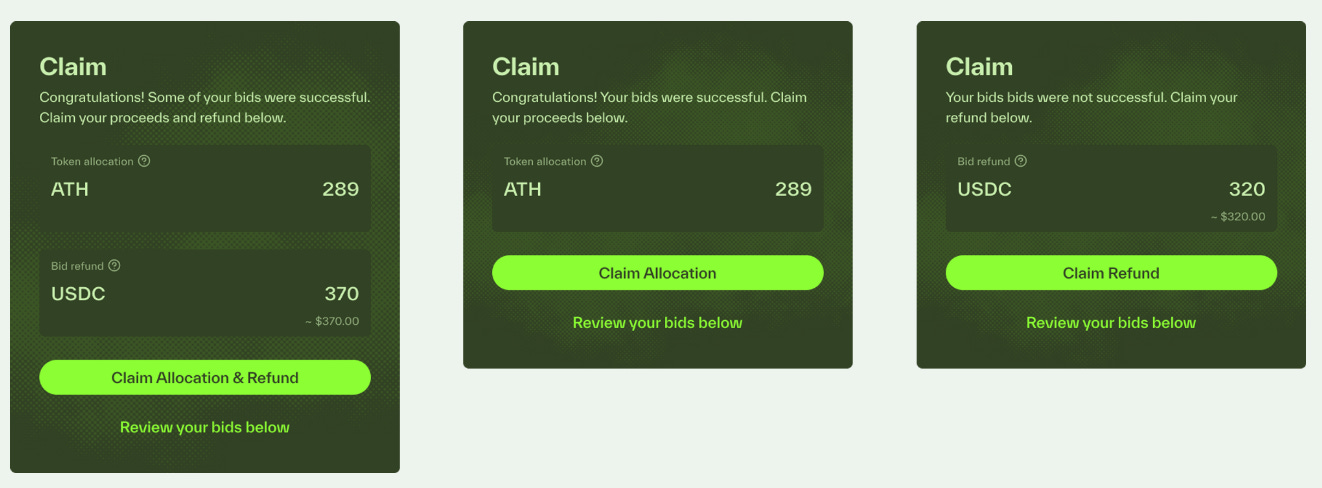 As the auction concludes, view the results on the left side. Connect your wallet, review outcomes, and claim your rewards: